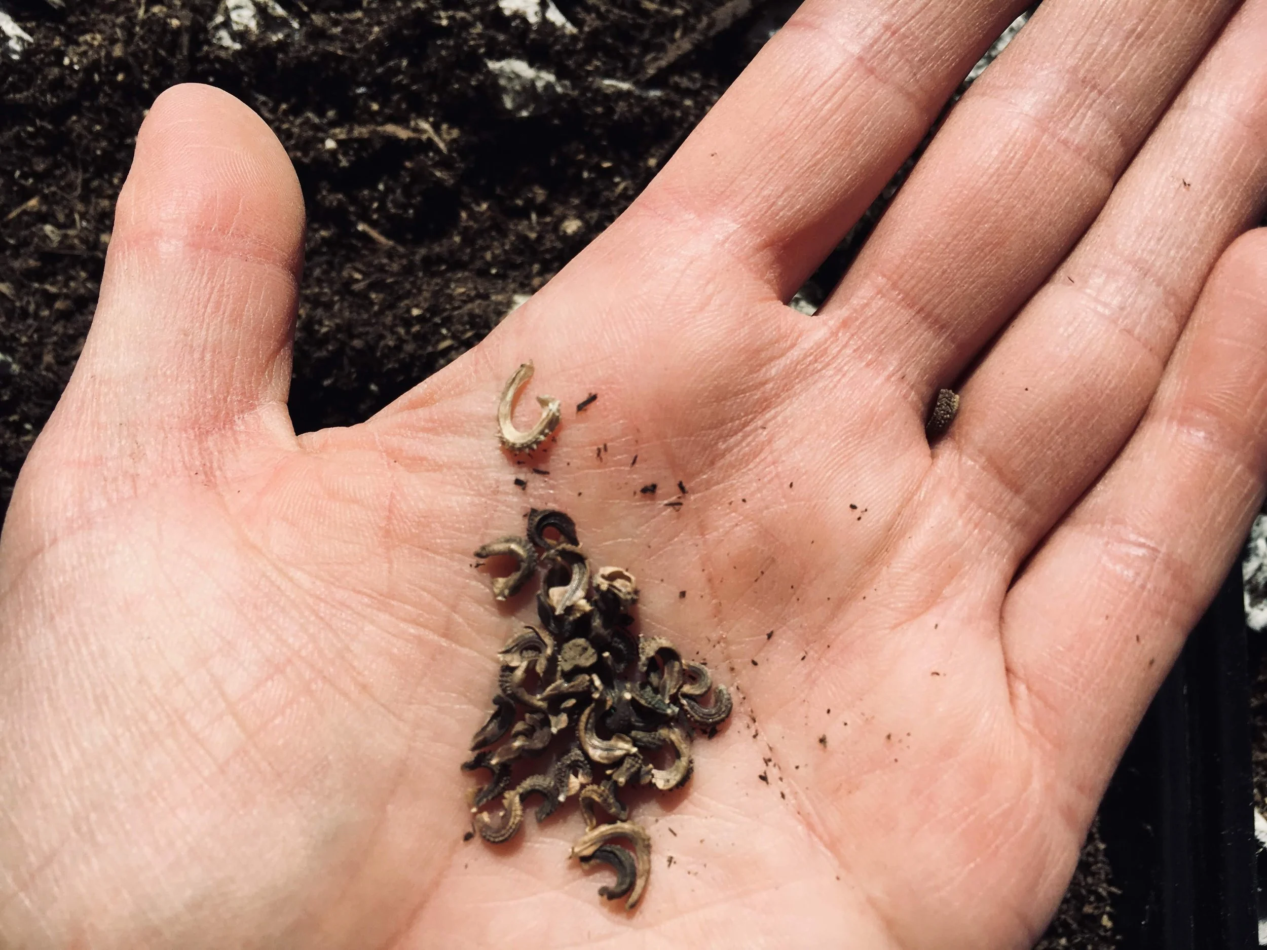 In permaculture design school this past summer, I was reminded that one of the many genius ways plants have adapted to survive and thrive is to make themselves easy to transport, as well as beautiful and delicious-I’m thinking of you Strawberry (read the essay, The Gift of Strawberries by Robin Wall Kimmerer for more on the wonder of human/plant relations); coupled with the fact that we humans have opposable thumbs and long arms and fingers- perfect for digging, grasping, transporting plants, saving and sowing seeds. I love stories of smuggled seeds, tiny saplings or a bundle of roots covertly tucked into the folds of fabric in a grandmother’s coat as she leaves the “old” land for the “new” one.